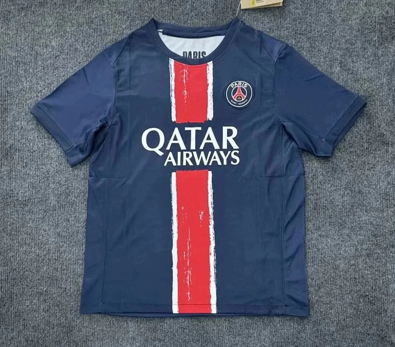 Aesthetically, the kit blends timeless charm with modern sophistication. The deep blue base of the jersey serves as the perfect backdrop for the bold red central stripe and delicate white borders, maintaining PSG’s recognizable color scheme. The club’s crest is heat-transferred in a premium rubber material on the chest, enhancing the jersey’s high-end feel, while the sleeves adopt a slim-fit design with refined cuffs for both comfort and style. The hand-painted effect on the stripe adds uniqueness, ensuring the kit stands out on the pitch while honoring tradition.