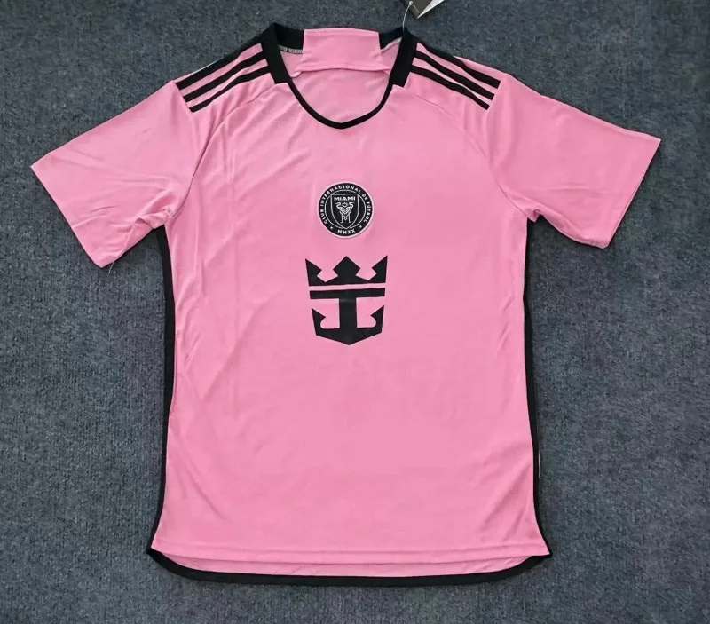 Aesthetically, the jersey retains Inter Miami’s signature pink identity, with a fresh light pink main body paired with refined black trims for contrast. The club’s crest is prominently displayed on the chest, while Royal Caribbean’s logo—prominently placed as the main sponsor—complements the color scheme harmoniously. The jersey was launched at a special celebration at Wynwood Marketplace, a hub of Miami’s art scene, further tying the kit to the city’s creative spirit.
