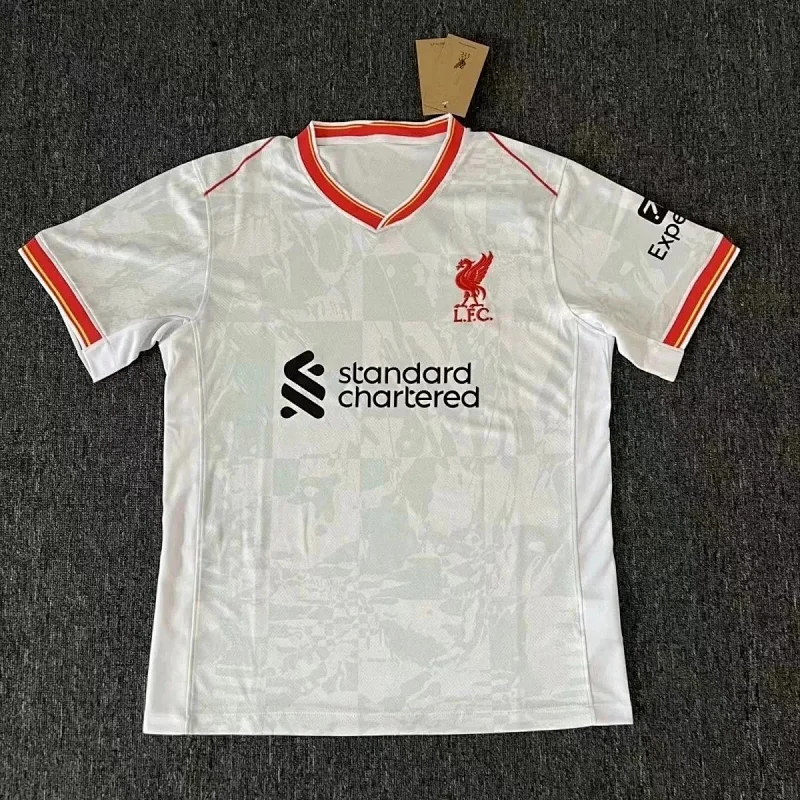Officially unveiled in late August 2024, Liverpool’s 2024/25 third away kit stands out as a symbol of progress and solidarity. Designed in collaboration with Nike, this strip is rooted in the “rebellious by design” concept, paying homage to female punk artists who shaped Liverpool’s cultural identity. The white base jersey is adorned with a bold mixed DIY-style print, incorporating subtle Liver Bird feathers that reflect the club’s iconic symbol.